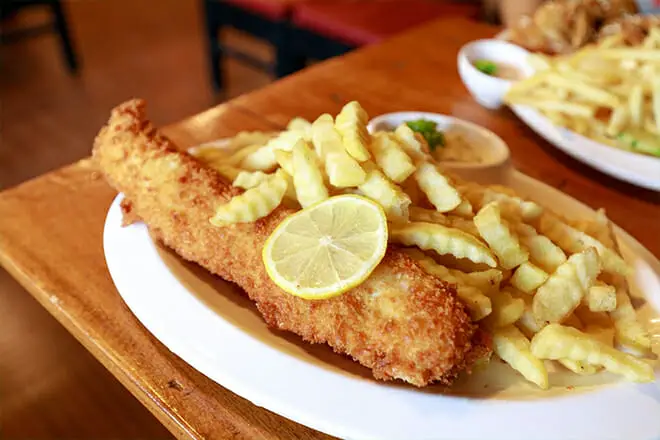Es un scrod fresco empanado y frito que se sirve con papas fritas onduladas y ensalada de col.