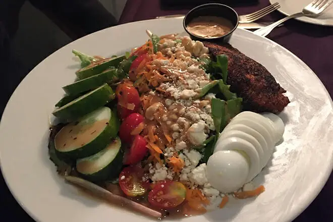 Comience su comida del lado más saludable probando la Gran Ensalada. Algunos ingredientes incluyen cebollas moradas, pepinos, verduras mixtas, tomates, repollos morados, huevos cocidos, zanahorias y el pollo de su elección.