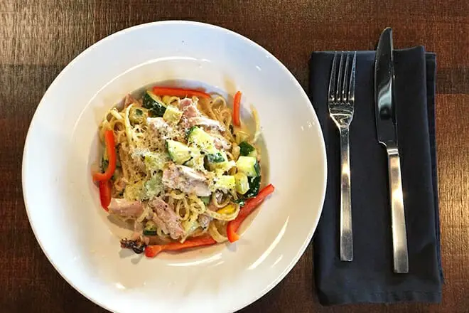 ¿Tienes sensibilidad al gluten? Entonces, recomiendo el Pescado Del Campo. Es una tilapia a la parrilla salteada con mantequilla, brócoli, ajo, cilantro, salsa de vino blanco, calabacín, pimientos verdes y rojos y champiñones. Incluye una guarnición de frijoles negros y arroz poblano.