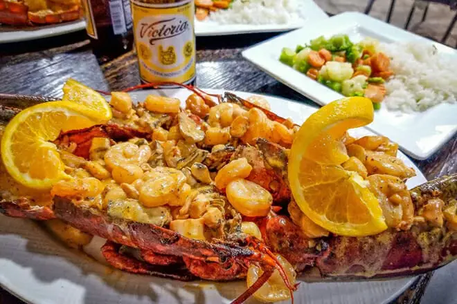 Sugiero la Cola de Langosta Rellena si prefieres las delicias a base de mariscos. Este favorito de la casa es una cola de langosta australiana rellena de pulpo, salsa de camarones, champiñones y vieiras. Viene con una guarnición de verduras y arroz.
