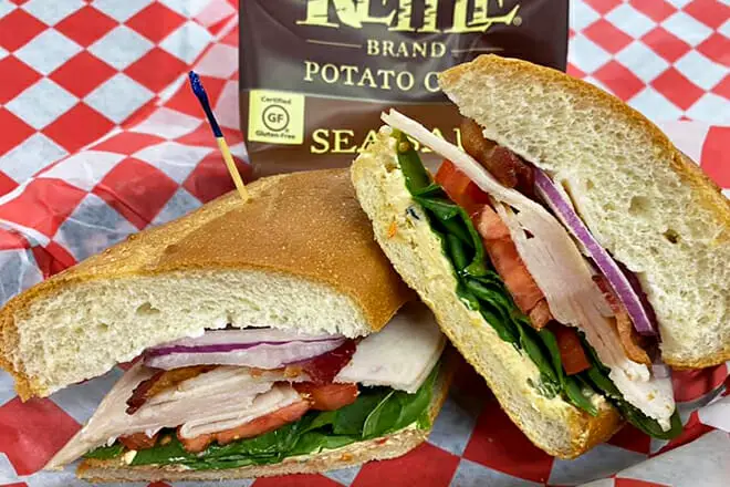 Empiece el día con una comida sana pidiendo el Laurel de montaña. Es un croissant relleno de queso crema, nueces, coles, pavo, pepinos, vegenaise y arándanos.
