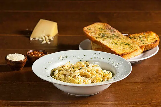 Disfrute de una sabrosa pasta para el almuerzo al pedir el Fettuccine Alfredo con pollo. Consiste en fideos fettuccine, pollo, una cremosa salsa alfredo y mozzarella.