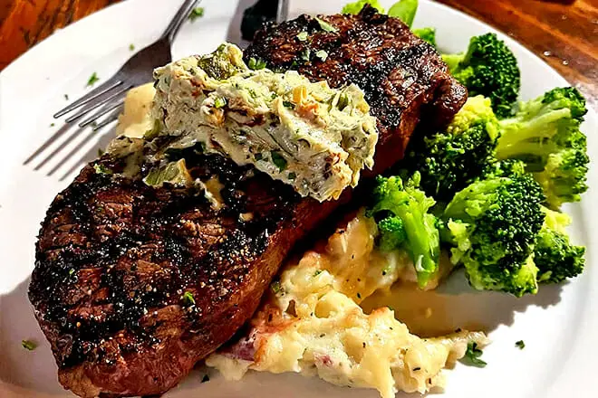 Disfrute de una exquisita cena de bistec probando el Steak Diane. Es un filete de Nueva York a la parrilla servido con salsa de champiñones, brandy y dijon.