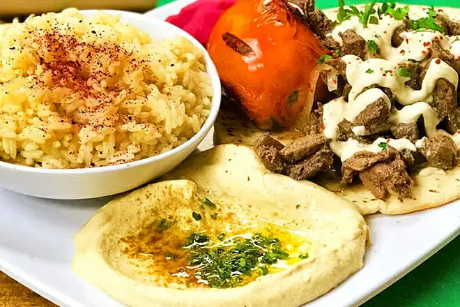 ¿Sigues una dieta sin carne? Si lo haces, te recomiendo el Falafel. Tiene lechuga, varias especias, cebollas, pepinillos, hummus, ajo, aceite vegetal y salsa tahini.