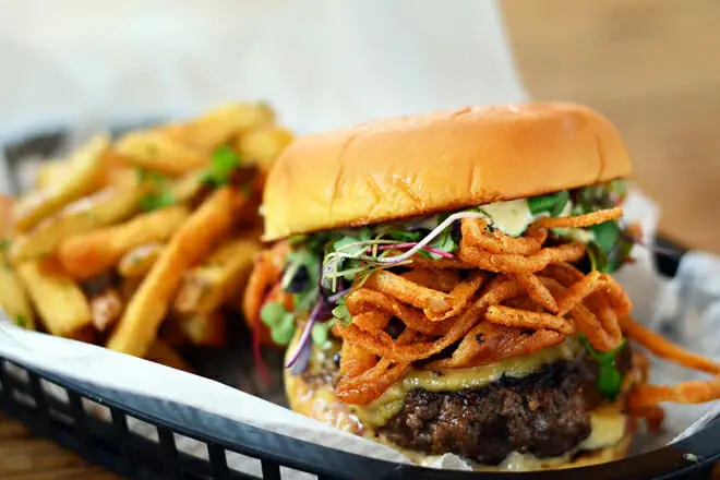 En un ambiente cómodo, dNB Burgers sirve hamburguesas creativas, papas fritas cortadas a mano y poutine, así como cerveza y vino.
