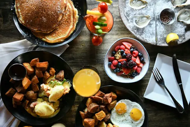 Sugiero el California Benedict para el desayuno. Es un panecillo inglés tostado cubierto con dos huevos escalfados, aguacate, salsa holandesa y tomates en rodajas.