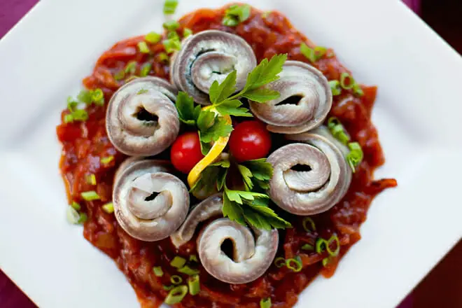 Estimule sus papilas gustativas con un delicioso aperitivo, como el arenque marinado. Es un arenque con crema agria, salsa de vino, remolachas en escabeche, cebollas y tomates en rodajas.
