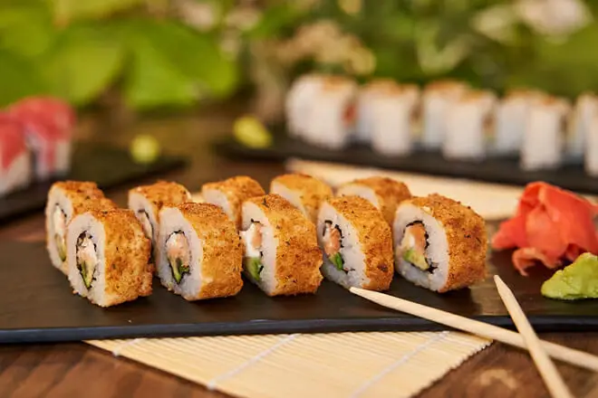 El Acevichado es una excelente opción para los amantes del sushi. Se compone de queso crema, salsa de ceviche, tempura de camarones, aguacate y salmón.