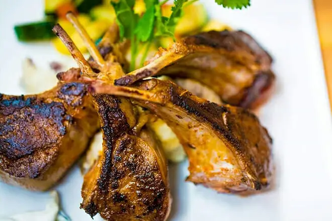 Si prefiere platos principales a base de carne roja, opte por el Tandoori Beef Tikka servido con pita, ensalada griega y salsa tzatziki.