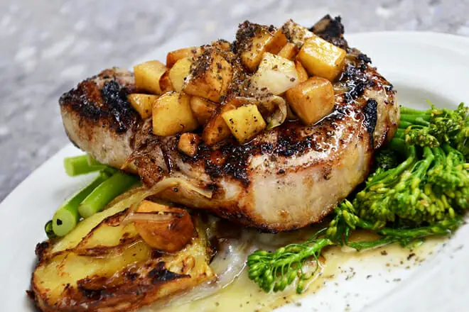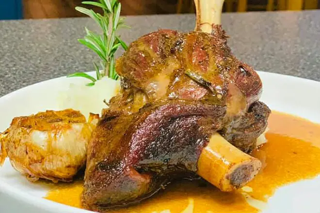 Pruebe un plato refinado para la cena, como la pierna de cordero estofada. Es una pierna de cordero asada lentamente con risotto cremoso, demi-glace de Cabernet y verduras asadas.