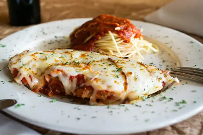 Otra excelente opción es el Pollo Parmigiana, que viene con pechuga de pollo empanizada, terminada con queso, albahaca y la salsa marinara característica del restaurante.