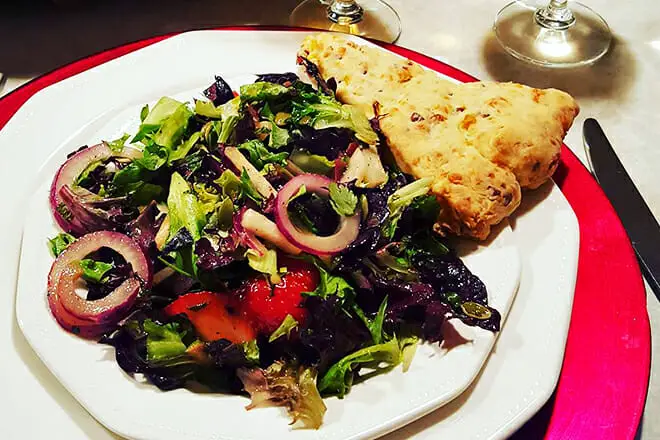 Comience su comida con un delicioso aperitivo probando el Queso De Cabra Con Tomate. Consiste en pan de ajo y queso de cabra horneado en salsa de tomate.