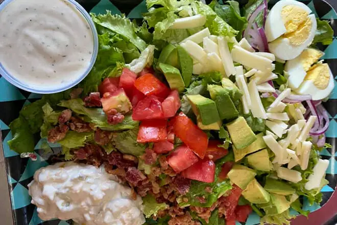 Pruebe una ensalada única ordenando el Wine & Cheese BLT. Incluye picatostes, lechuga, tocino, tomates, queso y vino.