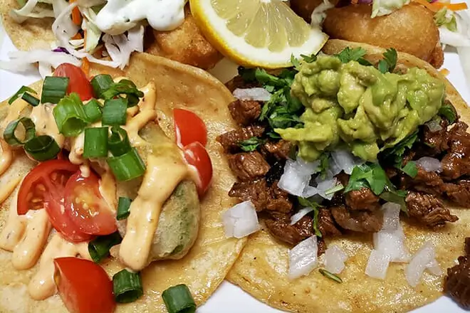 Pruebe un plato de inspiración asiática al pedir los Spicy Korean BBQ Tacos. Estas son tortillas de harina cubiertas con bistec de flanco marinado en casa, crema y ensalada de repollo asiático.
