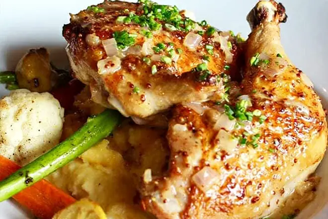 Ordene el estofado a fuego lento para probar un plato sabroso y carnoso. Viene con zanahorias con mantequilla, reducción de queso azul, coles de Bruselas, puré de papas y chirivías fritas.