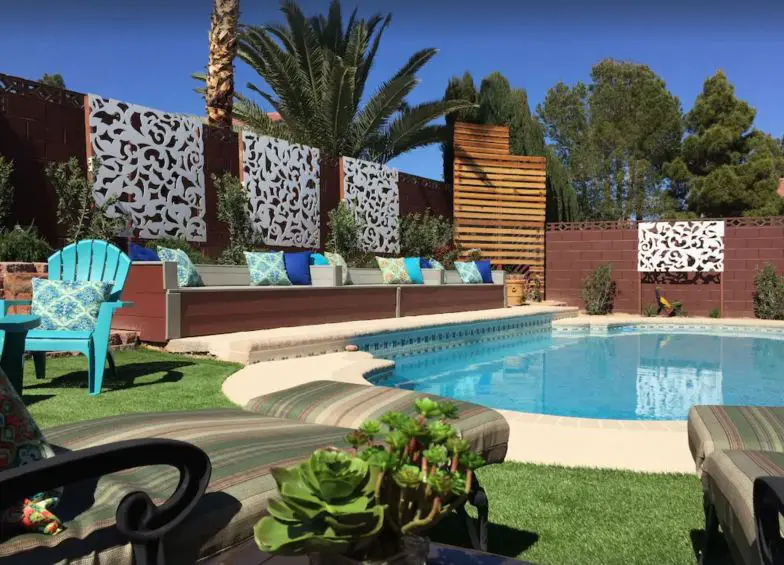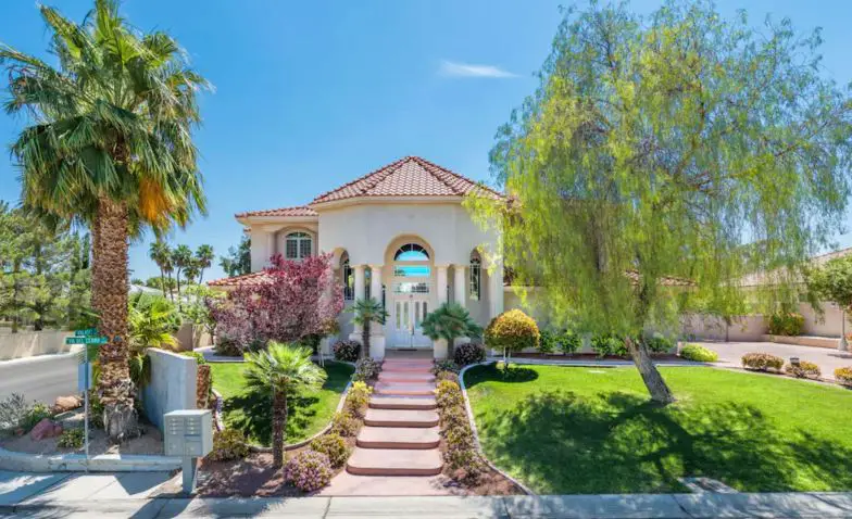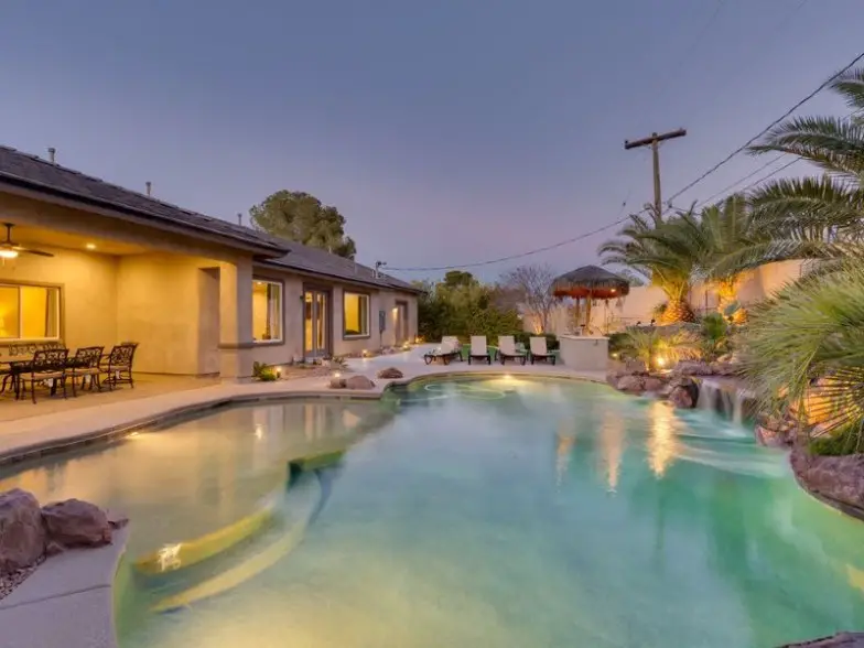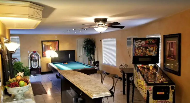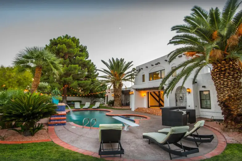 Esta casa de cuatro habitaciones con capacidad para ocho personas es ideal para una familia o un grupo de amigos. Perfecto para aquellos que quieren disfrutar tanto de la ciudad como de la impresionante naturaleza, está a solo 1,5 millas del centro de Las Vegas, cerca de Red Rock Canyon. Cada habitación tiene un tema único para brindar una sensación diferente, desde una "escapada a la playa" hasta el estilo español. Tiene una hermosa piscina al aire libre y jacuzzi, un exuberante oasis privado con árboles frutales y palmeras, e incluso un área de viñedos. Disfrute de divertidos juegos al aire libre como bochas y herraduras, o un juego de billar en el interior. Otras características notables incluyen una cocina de última generación, un televisor satelital de 65 ″ y una chimenea.