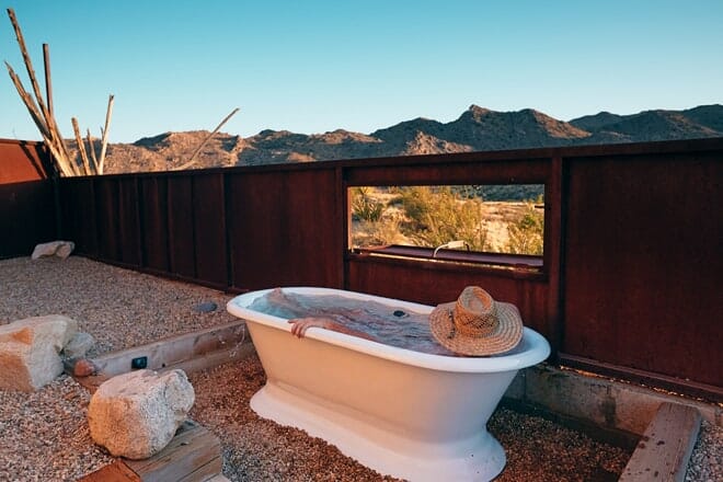 Los viajeros que deseen experimentar la atmósfera costosa de los hoteles de 5 estrellas en Joshua Tree adorarán el ambiente de oasis de este hotel. Es una elección favorita entre los mejores hoteles de Joshua Tree debido a sus alojamientos rústicos y zen.