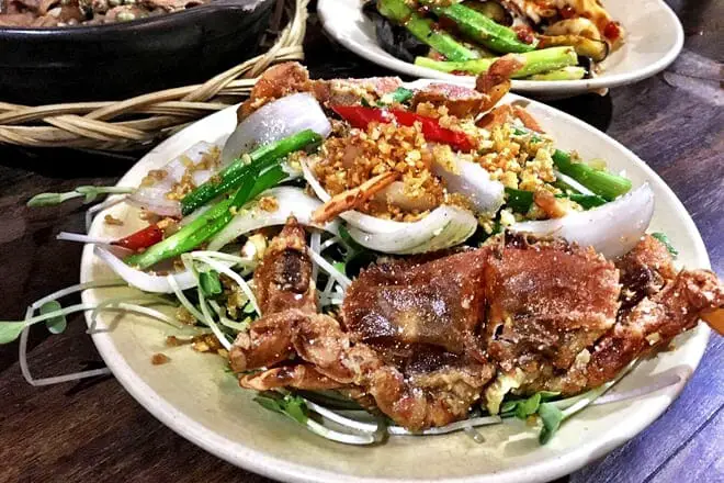 Disfrute de una comida satisfactoria en uno de los mejores lugares para cenar en Vietnam y pida algunos de los mejores platos del restaurante, como las flores de calabaza salteadas y el cangrejo de caparazón blando con tamarindo.