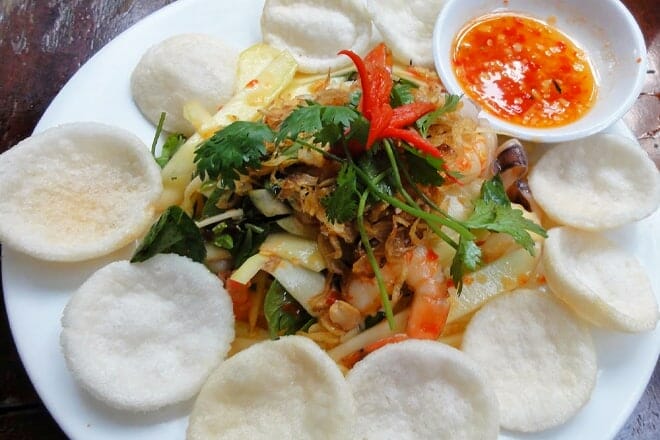 Comience su comida con la refrescante ensalada de la isla de Phu Quoc, que consiste en camarones, zanahorias, cebollas, pepino, pimientos verdes y rojos, piña, arroz con leche de coco y lima.