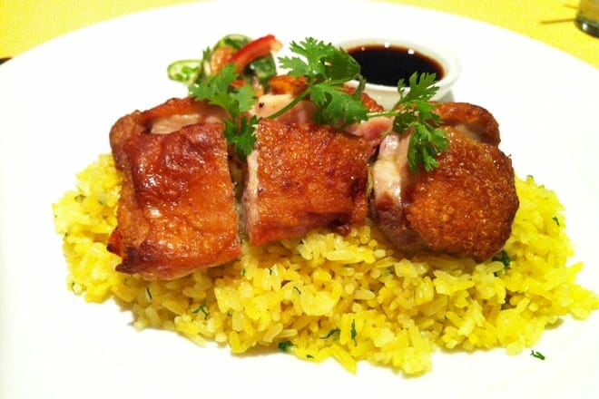 Comience su experiencia culinaria vietnamita y pida los rollos de ensalada de pato asado o las albóndigas de rosas blancas.