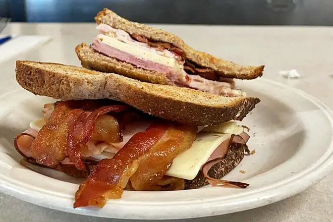 Pruebe un sándwich de tres pisos, como el Park Dinor Club. Consiste en pavo ahumado, jamón, tocino, tomates, queso americano y suizo, lechuga, mayonesa y pan tostado.
