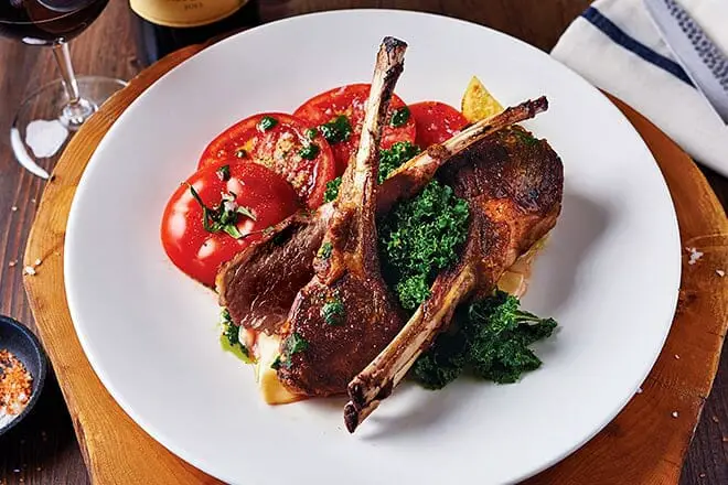 Prueba el cordero de Kahua Ranch, corte de carnicero para satisfacer tu carnívoro interior. Es cordero suave y sabroso cocinado con vegetales de Waimea, papas con jalapeño y adornado con chimichurri de menta.
