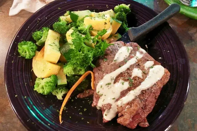 Y si quiere entrar un poco más tarde, vale la pena probar la chuleta de cerdo con hueso de 6 oz. Viene con puré de papas, verduras, salsa marrón y una tostada de Texas.