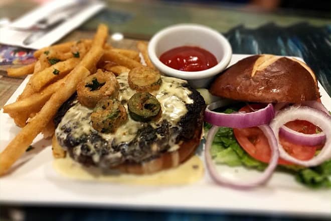 Este restaurante sirve una amplia selección de hamburguesas y sándwiches. Algunas de nuestras recomendaciones incluyen la hamburguesa Nacho Crunch, que consiste en una jugosa hamburguesa Angus, salsa casera de queso nacho, jalapeños y tiras de tortilla entre un panecillo de pretzel.