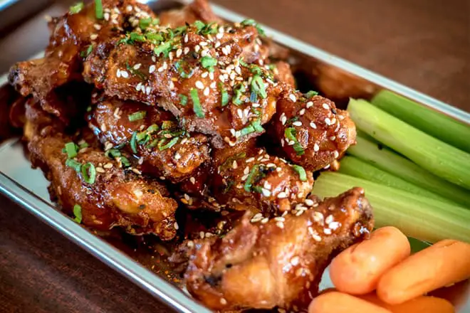 Comience la noche ordenando State 48 Wings con su salsa preferida. Puede elegir entre Buffalo, Bourbon BBQ, Honey BBQ, Jamaican Jerk Rub y Spicy Asian.