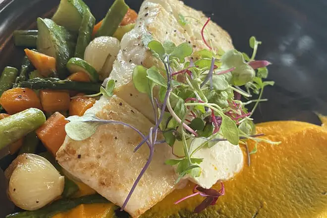 Dentro del pintoresco edificio de estilo colonial español recién construido, hay una docena de mesas vestidas de blanco, algunas de las cuales están situadas en el patio de adoquines junto al río St. Lucie, por lo que también se disfruta de una hermosa vista.