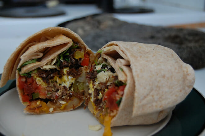 Pruebe los camarones envueltos en tocino sobre un pastel de sémola frita con salsa de tocino, o para el desayuno, pruebe el burrito de desayuno.