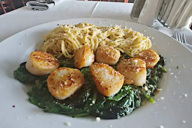 Su champagne risotto, astice e capesante es pecaminosamente delicioso. Es risotto Carnaroli con champán, salteado con salsa de langosta, vieiras y cola de langosta de 1/2 lb.