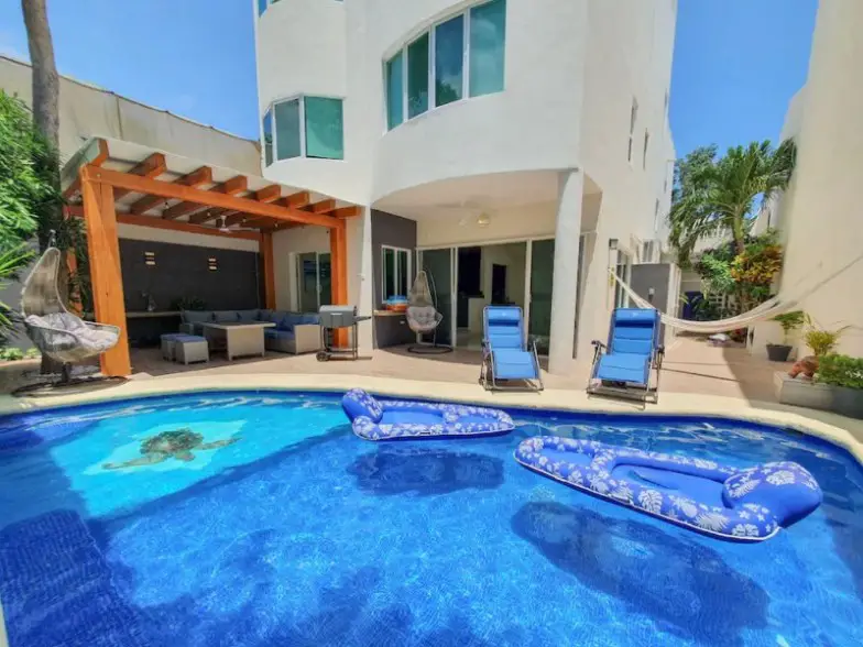Ubicada en la parte sur de Isla Mujeres, a solo ocho millas de Cancún, pero sin todos los mega-resorts y fiestas 24/7, Casa Santosha es una hermosa casa privada con capacidad para ocho personas. Tiene aire acondicionado y viene con una piscina climatizada y pista de natación junto con una terraza en la azotea para disfrutar de vistas panorámicas al océano y la isla. Tendrás una cocina totalmente equipada con todo lo esencial, un Smart TV de 80″ y un baño completo con ducha de lluvia doble, mientras que las playas de arena blanca están a solo 10 minutos en coche.