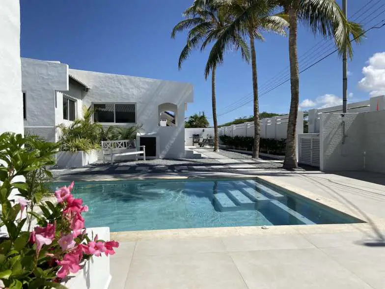Este espacioso Airbnb de dos habitaciones en Aruba se renovó recientemente con un estilo caribeño y cuenta con grandes espacios interiores y exteriores a pocos pasos de Palm Beach. Además de aire acondicionado y amplios dormitorios con grandes ventanales, la casa principal cuenta con una cama king-size y un Smart TV de 47”. Descanse en el lujoso sofá y mire el Smart TV de 55” en la sala de estar o aproveche la cocina totalmente equipada con cafetera y licuadora. Al aire libre, encontrará una piscina espectacular, así como una barbacoa privada con una mesa y sillas para cenar al aire libre.