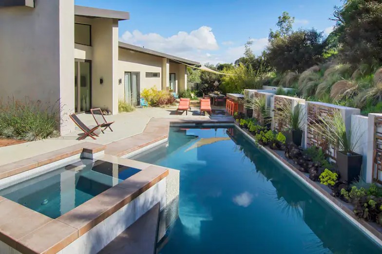 A los grupos de mujeres les encanta hospedarse en este paraíso rosado que se encuentra a solo 25 minutos de Palm Springs. Tiene capacidad para seis personas y es mejor para pequeños grupos de despedidas de soltera de amigos cercanos que quieren quedarse en casa y pasar el rato en lugar de salir a la vida nocturna. Las características únicas de la casa son la bañera de hidromasaje con azulejos rosas, el papel tapiz de flamencos rosados y los candelabros dorados. Es una casa de tres habitaciones digna de Instagram en una calle tranquila y remota que está fuera de lo común. Es divertido darse un baño en el jacuzzi, disfrutar de un chapuzón en la piscina (sin calefacción) en el verano y hacer girar el vinilo en el tocadiscos.