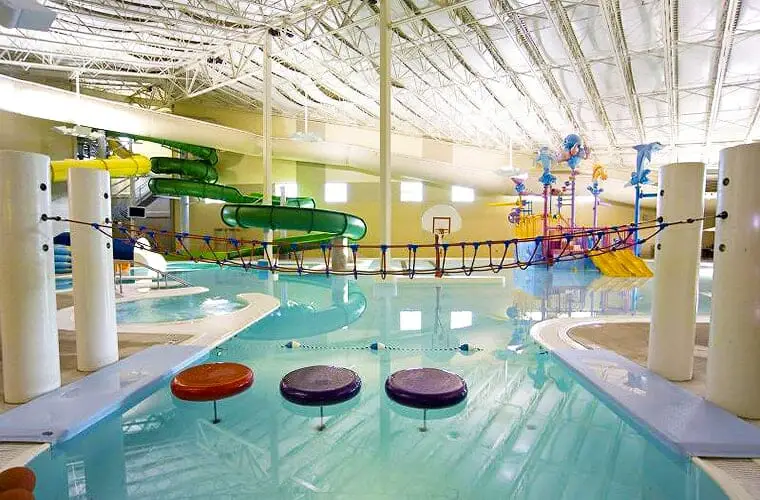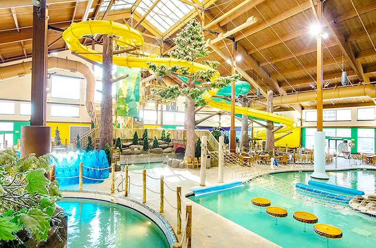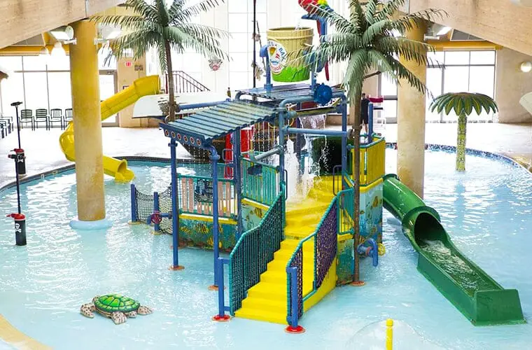 Los vacacionistas en este parque interior pueden disfrutar de 500 pies de divertidos toboganes, una piscina de olas, una piscina de calor cubierta y al aire libre, una torre de actividades, un cubo de basura que lo refresca con 500 galones de agua e incluso una piscina de actividades para niños pequeños para que los más pequeños no te sientas excluido.