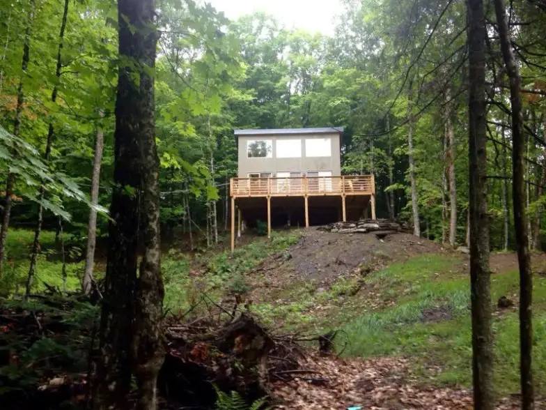 Aquí hay otra cabaña popular en New Hampshire y una que tiene capacidad para hasta cuatro personas. Está en 50 acres en el bosque y cerca del Bosque Nacional White Mountain, Rumney Rocks y estaciones de esquí. La cabaña cuenta con techos estilo catedral, un porche para granjeros, una terraza trasera y una hoguera. Está cerca de la casa del propietario, pero mira en la dirección opuesta y no tiene otros alquileres en la propiedad. Se permiten perros aquí con una tarifa de $ 25 por noche, y el anfitrión incluso brinda servicios para perros como una cama y tazones. Wi-Fi también está disponible en la propiedad.