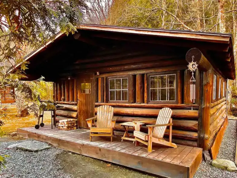 Larger groups up to nine people can stay at this four-bedroom, two-bathroom cabin that’s 20 minutes from Sqaum Lake and the activities of the White Mountains. It’s an excellent getaway for families or groups of friends who like to be surrounded by wildlife and have lovely views of the mountains and forest. Outside of the home, you’ll find a trail that follows the stream up the mountain and also a horseshoe pit nearby. The area also has a beautiful covered bridge, horse farm, and pond for fishing and kayaking.