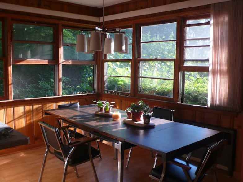 Para un retiro moderno en una casa del lago en un bosque aislado, considere este Airbnb convenientemente ubicado con una terraza privada. Tiene capacidad para 10 personas y tiene tres dormitorios y dos baños. Para divertirse aquí, hay ping pong, futbolín, kayaks, una canoa, paddleboards, hamacas y asientos al aire libre. La casa también cuenta con lavadoras, una cocina abierta y chimeneas para fines de semana acogedores durante todo el año. Las mascotas pueden unirse a usted en este alquiler frente al mar.