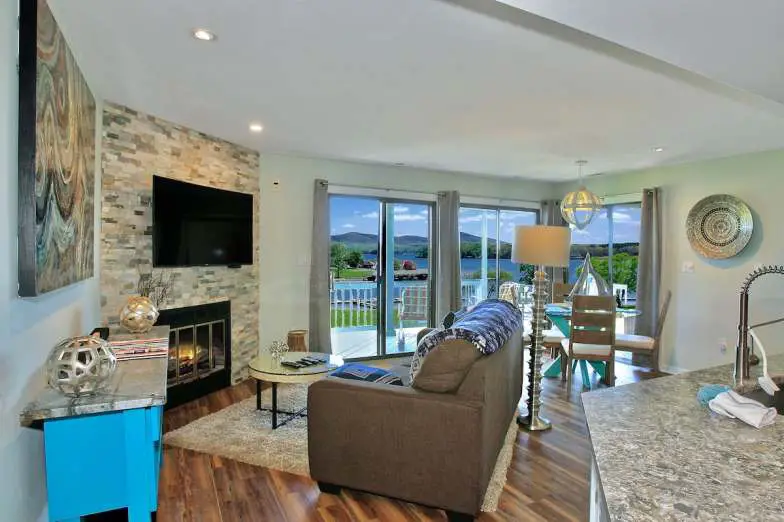 Disponible para alquilar en Vrbo, esta es una casa de cuatro dormitorios y 4.5 baños con capacidad para 12 personas junto al lago. Ofrece una bañera de hidromasaje, un muelle, una terraza, una parrilla y mucho espacio para que las familias se extiendan y se relajen. La casa está cerca de Bridgewater Plaza, lo que facilita el acceso a restaurantes y supermercados. Las características de la casa incluyen una cocina bien equipada, chimenea y sala de juegos con mesa de billar y juegos de mesa.