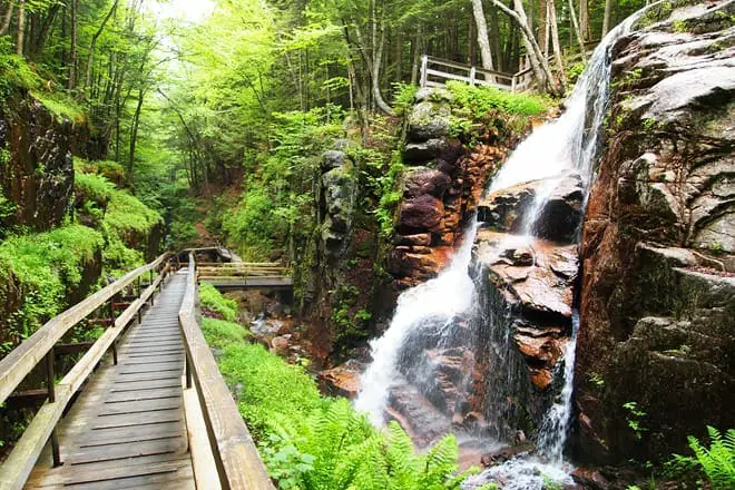 Flume Gorge es uno de los mejores lugares para ver en New Hampshire que puede satisfacer los antojos de cualquier viaje por la naturaleza. No solo es una vista espectacular, sino que también está rodeada de cascadas y formaciones rocosas. También tiene llamativos toques hechos por el hombre, como puentes y pasarelas de madera.