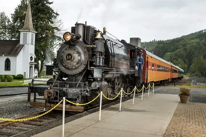 Viaja en la locomotora antigua en Mt. Rainier Railroad para obtener 18 millas de majestuosas vistas panorámicas de las montañas. En un extremo de las vías, incluso tendrá tiempo para explorar un museo maderero.