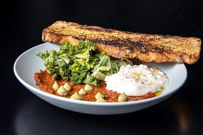 Disfrute de un brunch ligero pidiendo el Coffee Max Ziva. Es un hojaldre relleno de queso con una guarnición de huevo cocido y salsa de tomate rallado.