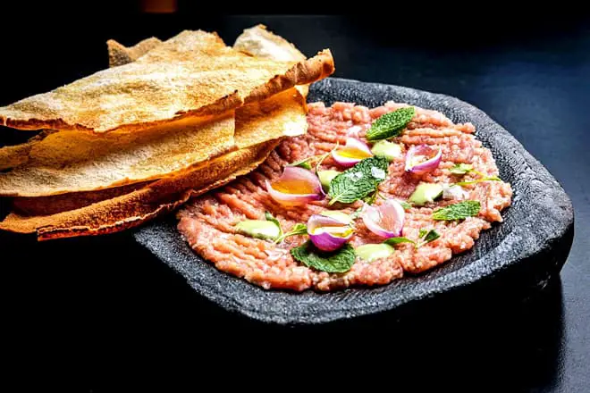 Ordene el STT (Salmon Tartare Toast) para probar otro plato a base de pescado. Se compone de salmón, pita, edamame, chile dulce, ponzu y hummus.