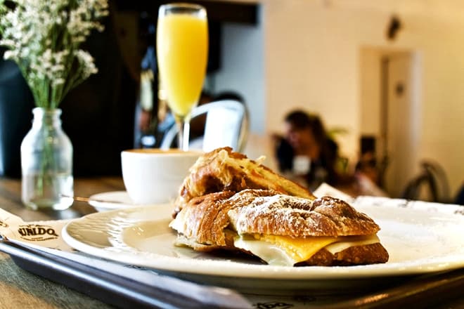 Comience su día con un abundante desayuno ordenando el AM Sandwich. Es un pan brioche con queso, salchichas, huevos y alioli de achiote servido con una taza de café.