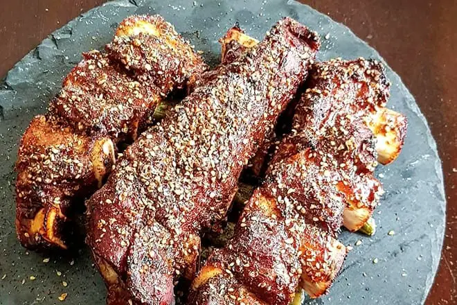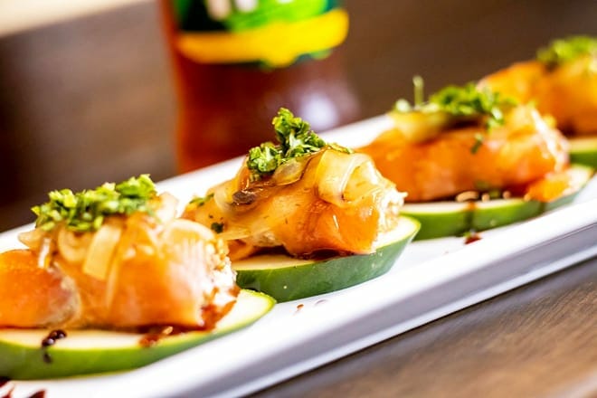 Los Rollitos de Salmón Ahumado son una opción perfecta si te encanta la carne blanca. Tiene un relleno de camarones, queso crema, alcaparras y tomates, se sirve con una vinagreta de miel y mostaza.