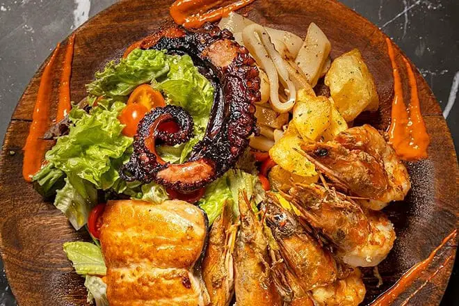 Si tienes gusto por los platos de estilo criollo, prueba la Cazuela Criolla Mixta. Se compone de pescado, pulpo, conchuela, langostinos, ostras, calamares y más.