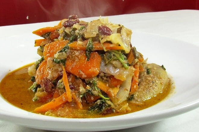 ¿Sigues una dieta sin carne? Si lo haces, te recomiendo pedir The Vegan. Es un hojaldre vegano, pan o tortilla con tomates asados, frijoles negros, zanahorias y cebollas en escabeche.