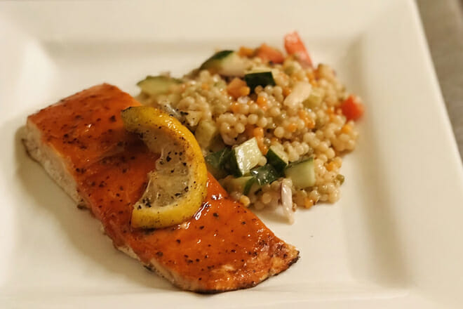 Comience con el Portobello Relleno de Mariscos y la Ensalada César.