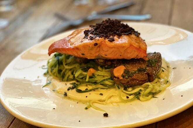 Y para una comida sabrosa, pida el Duck Two Ways, una pechuga de pato a la sartén y pierna confitada, con farro pilaf ahumado, judías verdes con nueces y mantequilla marrón y un puré de calabaza y jengibre.